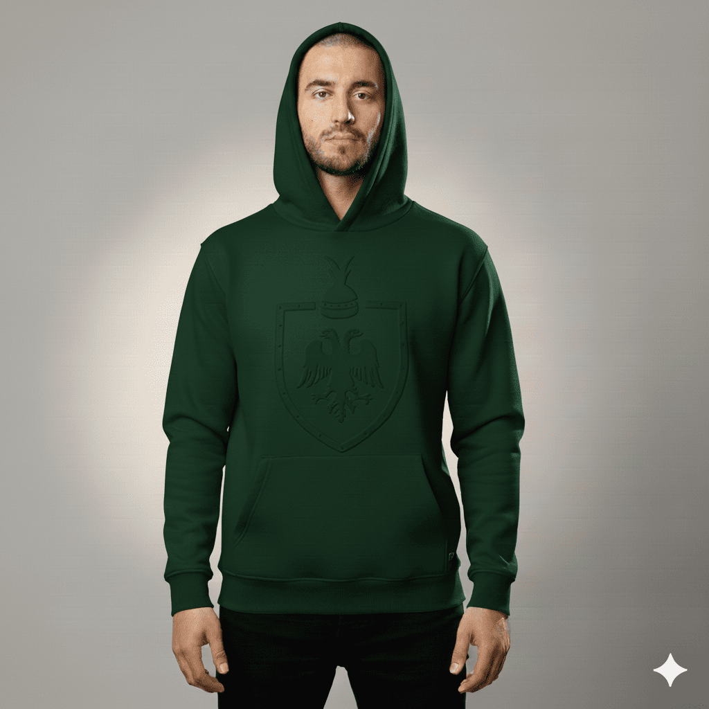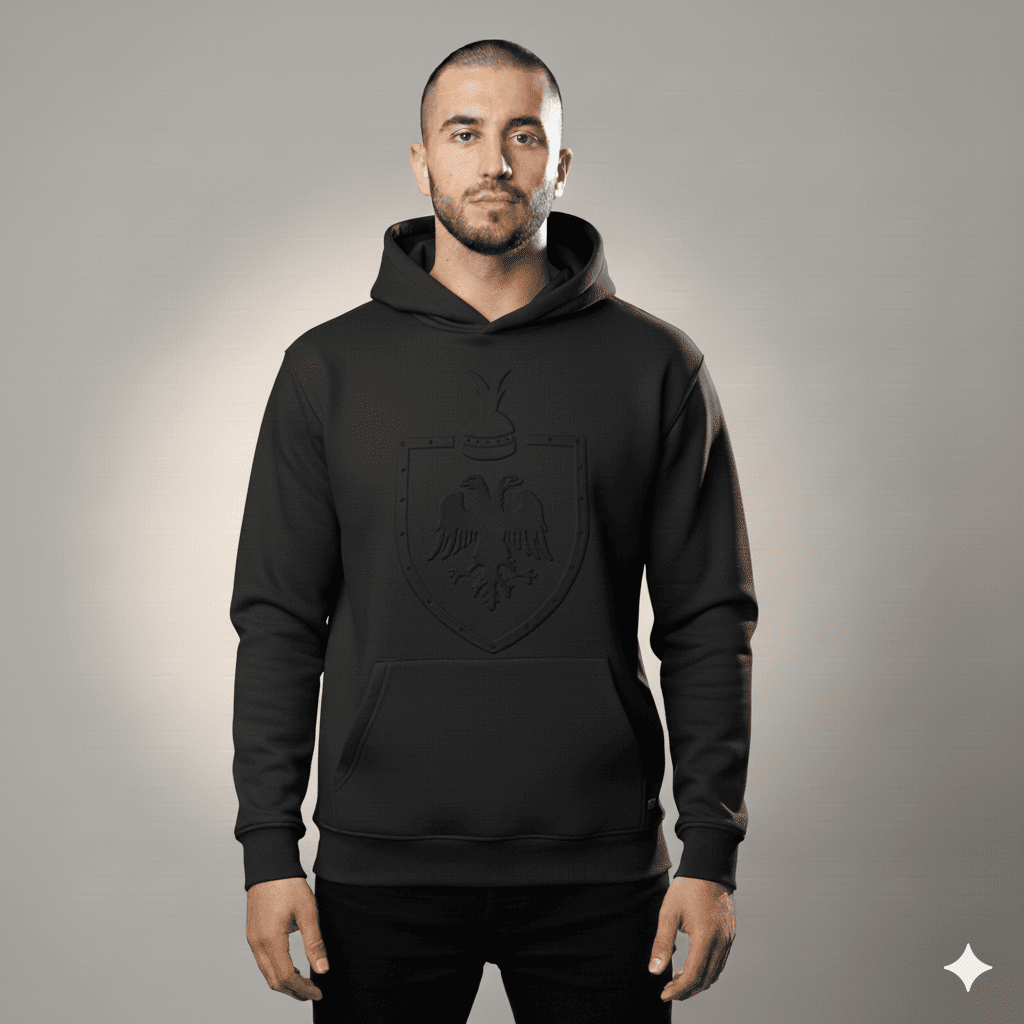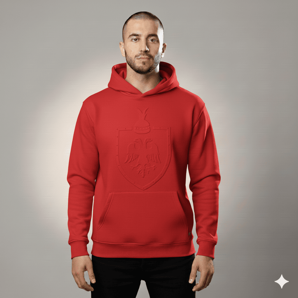 E frymëzuar nga përkrenarja legjendare e Gjergj Kastrioti Skënderbeu, kjo bluzë përfaqëson forcën, trimërinë dhe qëndrueshmërinë e popullit shqiptar ndër shekuj.